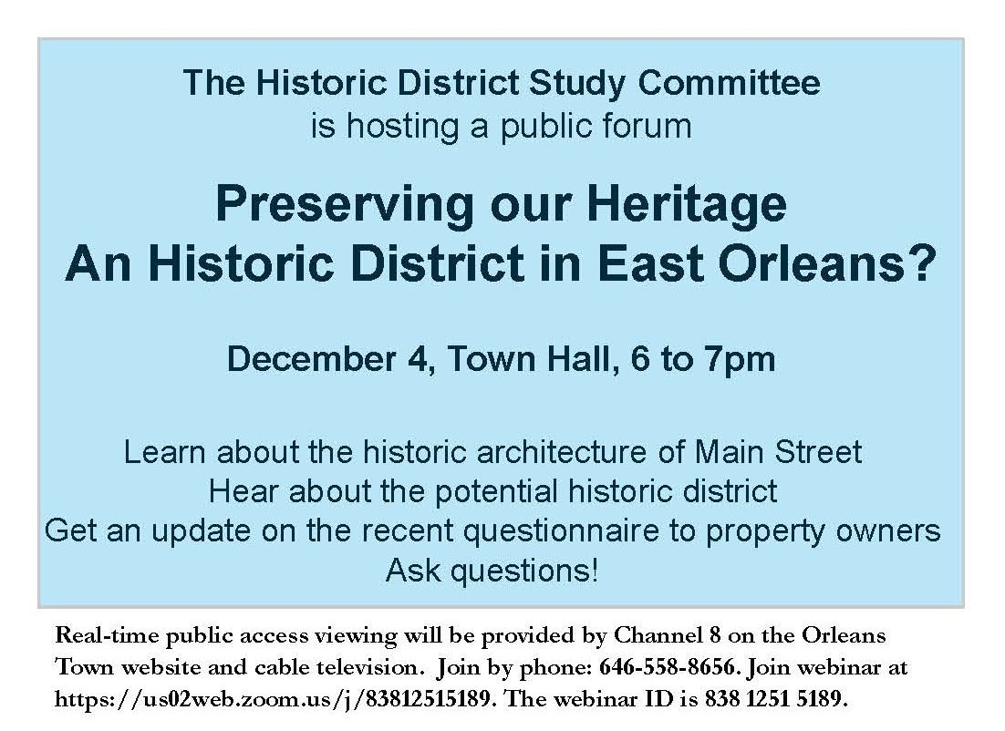 The Historic District Study Committee is hosting a public forum in Town Hall on December 4, 6 - 7PM, on "Preserving our Heritage - An Historic District in East Orleans?" Please read on for details.
